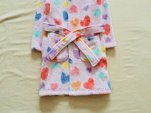 F&F 3-4 рок., 104 зріст пухнастий махровий халат з Сердечками з капюшоном банний, флісовий, теплий. на море або в басейн. Стан: нової речі, слідів носки немає. Зав´язується на талії пояс. Кишені.довжина 62; рукав від вороту 43