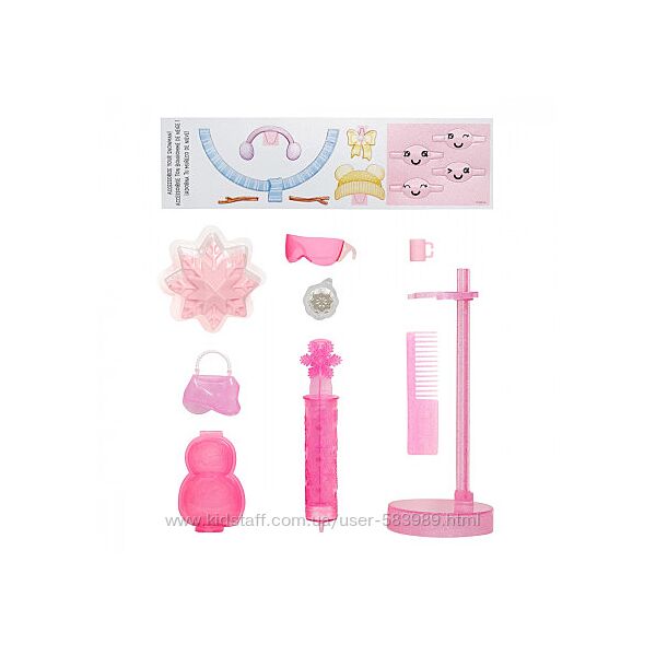 - передбачено: лялька (28 см), худі, куртка, спідниця, пара взуття, шприц, сонцезахисні окуляри, сумочка, кухоль, форма для ліплення сніговика, картка для сніговика, кінетичний пісок, гребінець, підставка для ляльки, пачка блискучого порошку, інструкція;