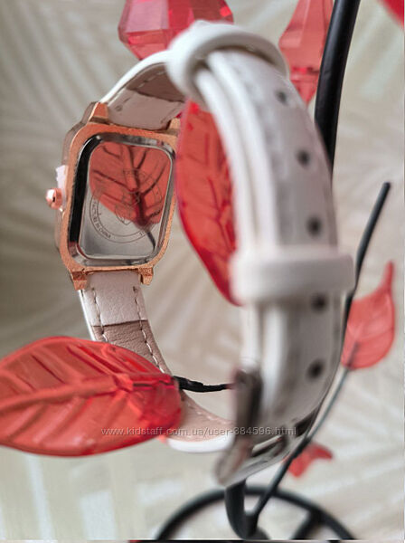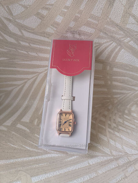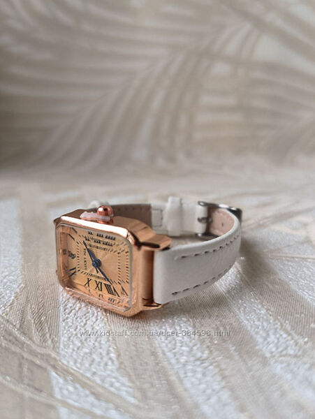 Квадратний циферблат із римськими цифрами розміром 2*1,5 см. Корпус із золотистим покриттям. Універсальний і зручний білий ремінець довжиною 22 см. Підійде як для повсякденного носіння, так і для особливих випадків.