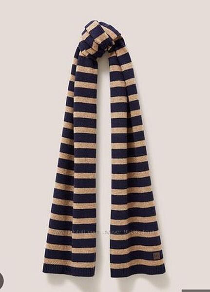 Вовняний шарф у смужку White Stuff, чудова якість, реальний колір на промофото. Шарф абсолютно новий, модель і зараз є на сайті в наявності. На ньому зрізана бирка зі складом, додаю на промофото фото зі складом зі сайту: 80% вовна, 20% нейлон для зносостійкості. Абсолютно новий, без паперових бирок і бирки зі складом. В ціні враховано.розмір 185 на 28