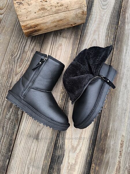 Угги высокие кожаные натуралочки ЧЕРНЫЕ со змейкой молнией с внешней стороны ноги сапожки теплые женские зимние с лейбл UGG на пяточкес черной лейбл арт U-129-11