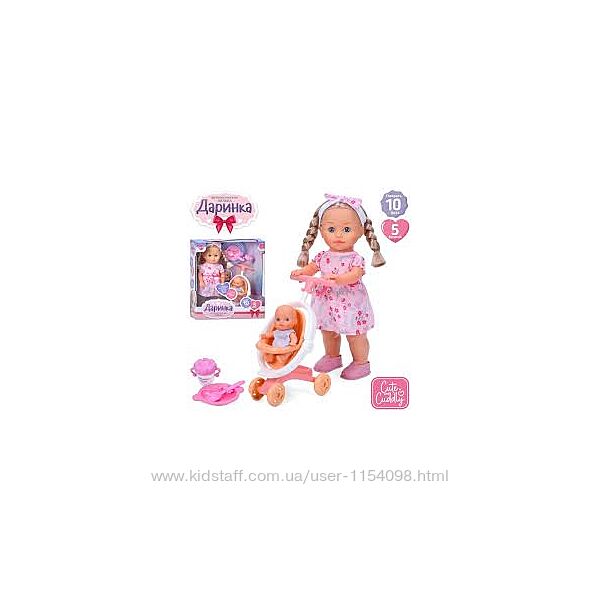 Лялька Даринка (40 см): Виготовлена з високоякісних матеріалів, безпечних для дітей. Має красиві світлі косички, виразні блакитні очі та одягнена у стильну рожеву сукню з квітковим візерунком.Пупс: Маленька лялька-пупс, яку Даринка може "вигулювати" у колясці. Іграшковий пупс допомагає розвивати турботливість та відповідальність.Коляска: Стильна та міцна коляска для пупса зручна для гри та легко переміщується. Діти можуть катати пупса, як у справжньому житті.Набір посуду: Включає тарілочку, ложечку та чашку-непроливайку. Ідеально для сюжетно-рольових ігор, що допомагають розвивати навички догляду та побутові вміння.Характеристики: