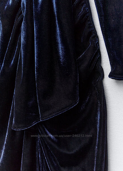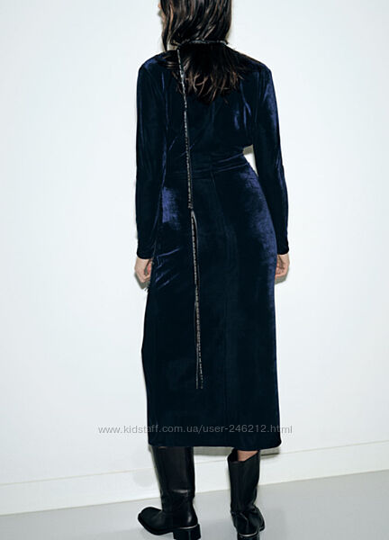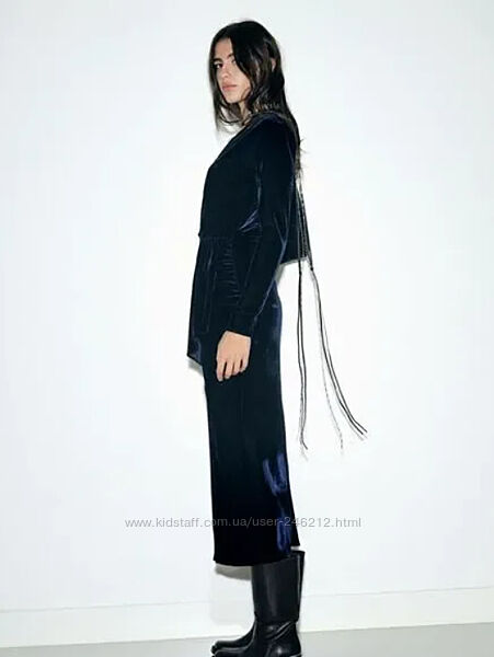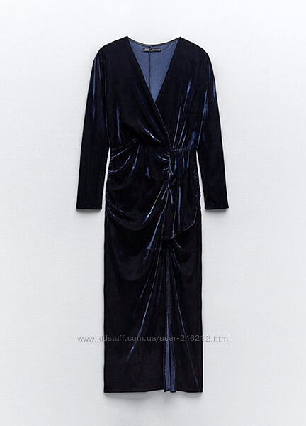 Оксамитова сукня Zara на запах з розрізом та декольтеТемно-синя сукня з V-подібним вирізом і високим розрізом.
