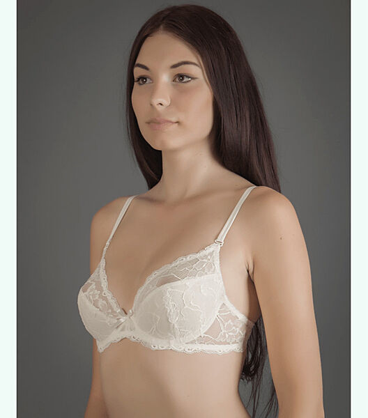 Бюстгальтер з м'якою чашкою, вшиті кісточки, знімні бретелі,легко регулюються, всередині бавовняна підкладка для більшого комфорту.Задня частина виробу пошита з мережива, застібка – один гачок із вибором із трьох позицій.