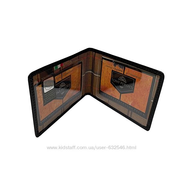 Матеріал: Натуральна шкіра Фактура шкіри: Гладка Розмір: 11х8.5 см Колір: чорний Країна виробник: Італія Виконана із верхнього шару шкіри бика. На лицьовій частині виробу тиснення у вигляді фірмової черепашки та написи tony perotti. Аксесуар має 2 відділення для документів типу ID-карти, пропуску, посвідчення водія, тех. паспорти на автомобіль тощо. Усередині прозорі файли, завдяки чому можна пред´являти документ, не виймаючи з обкладинки. Підкладка фірмова, у клітку. Всередині також знаходиться голограма справжності виробу.