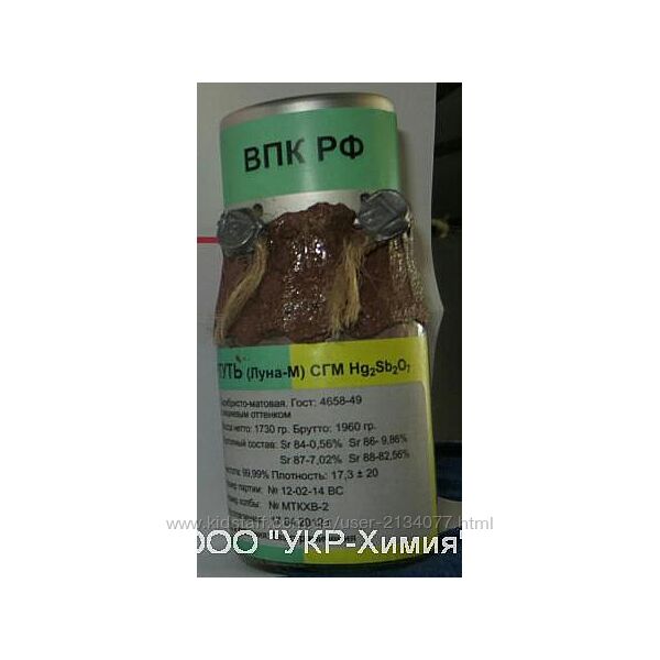 Продукт (Луна -М)/СГМ, Hg2Sb2O7, плотность от 17,3- 20 грамм/см3 , вес 1730 грамм , цвет - серебристо -матовый с вишневым оттенком.Масса нетто: 1960 грамм.Оксистибат ртути — пироантимонат (формула Hg2Sb2O7).