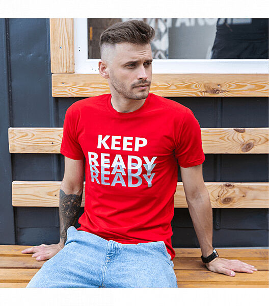 Стильна модель для походів на роботу, навчання, занять спортом або прогулянок на природі. Все це про нашу чоловічу футболку з нової колекції. Виріб має короткі рукави та класичний прямий силует. Оригінальності виробу додає принт KEEP READY, розташований на грудях. На лівому рукаві виробу є фірмовий прапорець. Оригінально виглядає виріб з деніму.Склад тканини: 95% бавовна 5% еластан