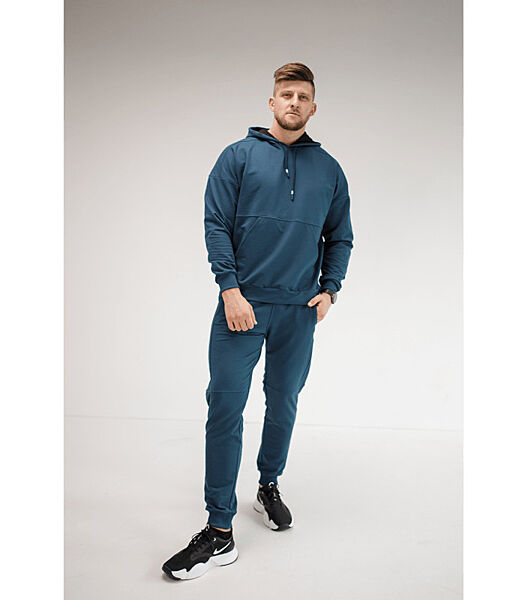 Практичний і водночас стильний чоловічий костюм з худі та капюшоном складається зі спортивних штанів на манжеті та толстовкою з капюшоном і кишенею-кенгуру.