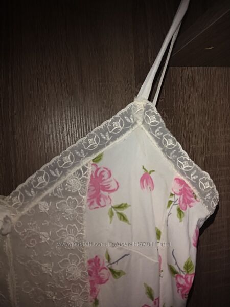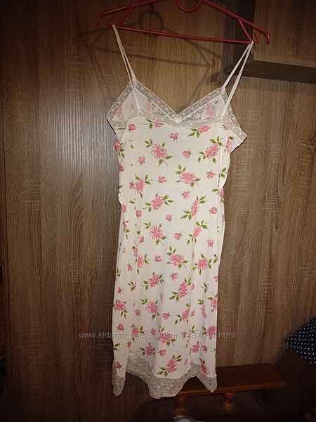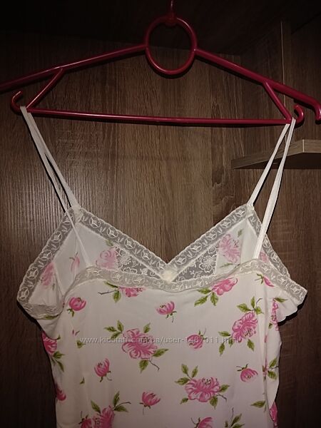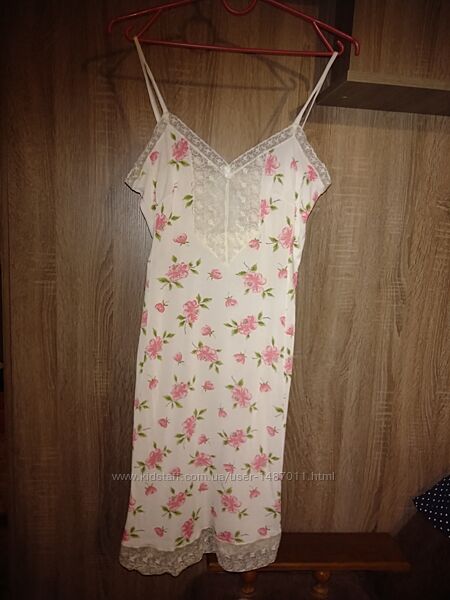 Комбинация на тонких бретельках женская ГДР (винтаж). Размер европейский 40 - соответствует нашему 46 размеру. Цвет белый, с розовым "цветочным" принтом. Украшена вышитым кружевом по краям и в области груди. Материал - тонкий мягкий трикотаж, 100% полиэстер.Длина 100см, окружность груди 92см, окружность бёдер 100см.