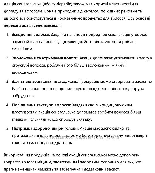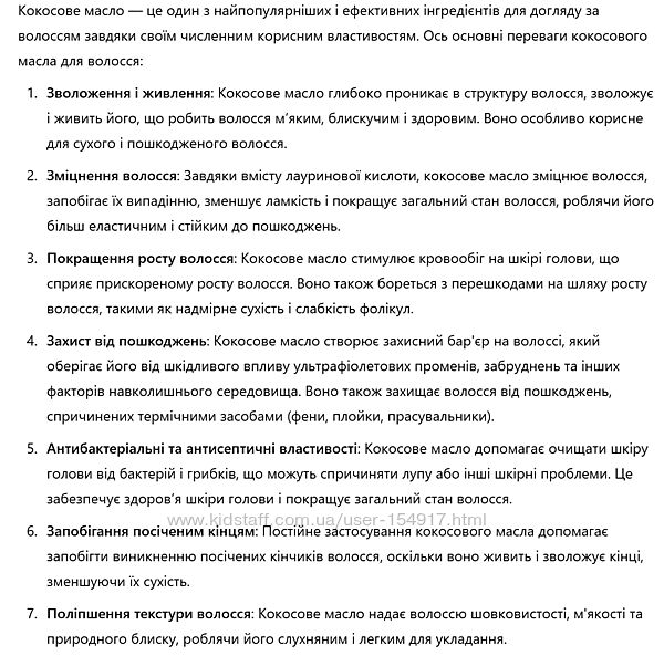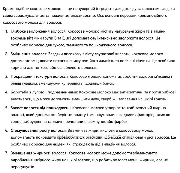 Кондиціонер має натуральний склад та ніжний кокосовий запах - не нав´язливий і не задушливий, волосся після нього м´яке, зволожене і добре розчісується. Даний кондиціонер ущільнює волосся та робить його важчим, особливо гарний для догляду у зимовий час, коли волосся піддається перепадам температур. Засіб потрібно наносити зовсім небагато, добре розплутує та надає шовковистості. Підійде навіть прямому волоссю.