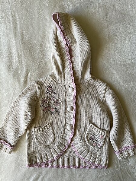 Кофта Next з капюшоном на дівчинку 2-3 роки.Колір молочний. Склад тканини: 45% бавовна, 55% акрил.