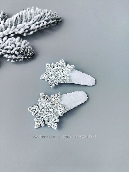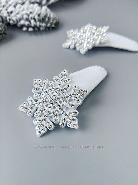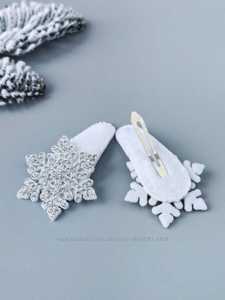 Білі оксамитові заколочки з блискучою сніжинкою.