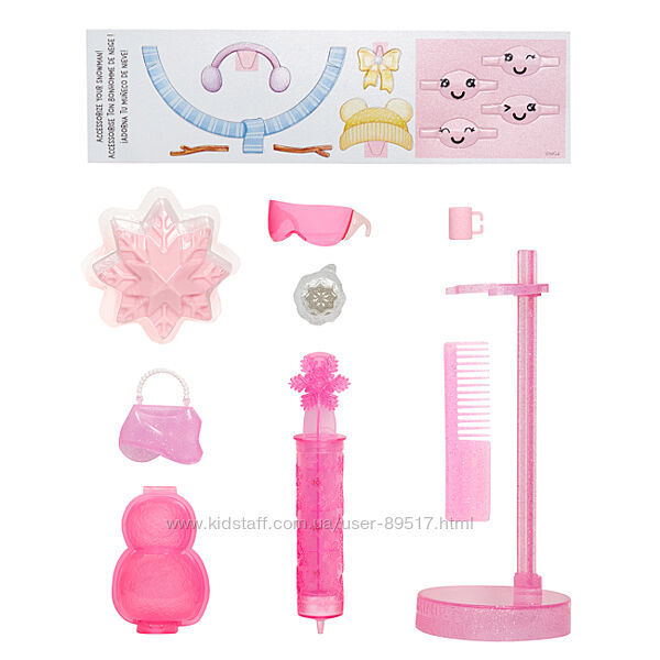 • У ляльки чарівний «сніг» в одязі! За допомогою шприца, додайте до снігу трохи прохолодної води та спостерігайте, як сніг чарівним чином розпушується та змінює колір, змінюючи образ модниці;