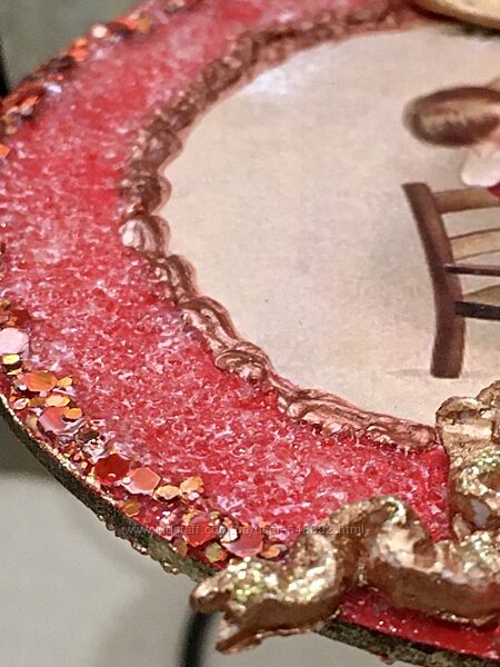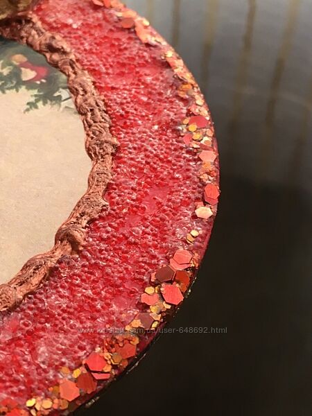Сделана в технике декупаж в винтажном стиле, покрыта лаком. В работе использованы декоративные художественные материалы, безопасные для здоровья.Работа сделана с применением различных техник. В единственном экземпляре, диаметр 10 см.