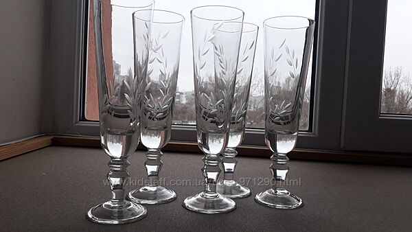 5 старинных высоких фужеров. Гравировка выполнена вручную. Стекло имеет легкий оттенок, множественные пузырьки воздуха в стекле. Высота 21,5 смЦена за набор 5 штук