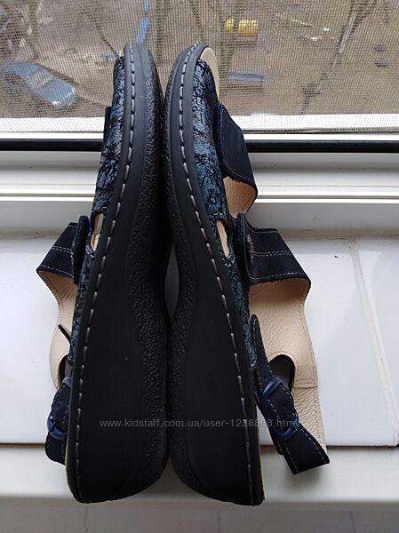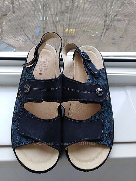 Кожаные ортопедические босоножки от швейцарской фирмы Belvida by Portina.Изготовлены из мягкой натуральной кожи синего цвета.Размер 40 длина стельки 26см., ширина стельки 9см., босоножки на липучках_подойдут для стоп с косточками и другими нюансами.