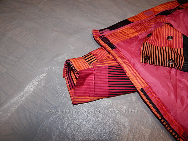 НЮАНСИ - темнуваті неяскраві плямки від бугеля на манжетах та поруч з ними, на зовнішніх кишенях та внизу, злегка потерто та дещо заношено самі манжети, трішки заношено комір з середини, що змогла показала на фото. При носінні непомітно. Куртка різнокольорова та яскрава, за рахунок цього недоліки не видно.