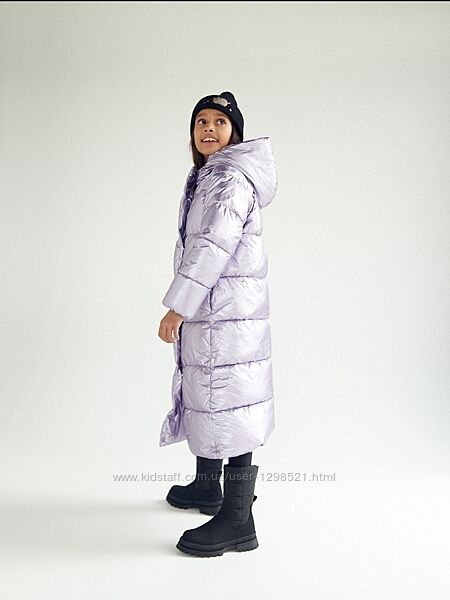 Утеплене пальто класичного крою зі стьобаного матеріалу з легким блиском.Каптур з коміром-стійкою,