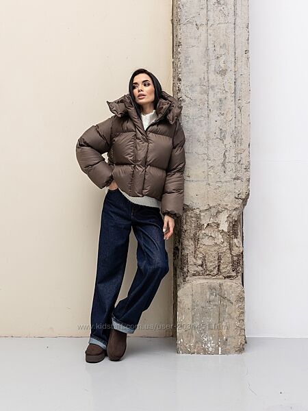 Подробное описание: Пуховик женский короткий оверсайз, со съемным капюшоном автоледи коричневый