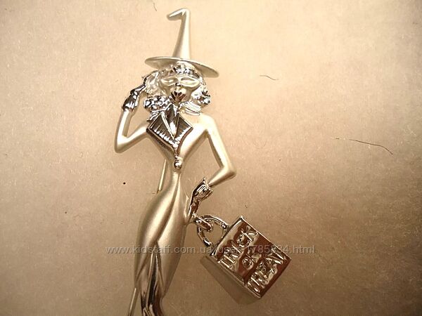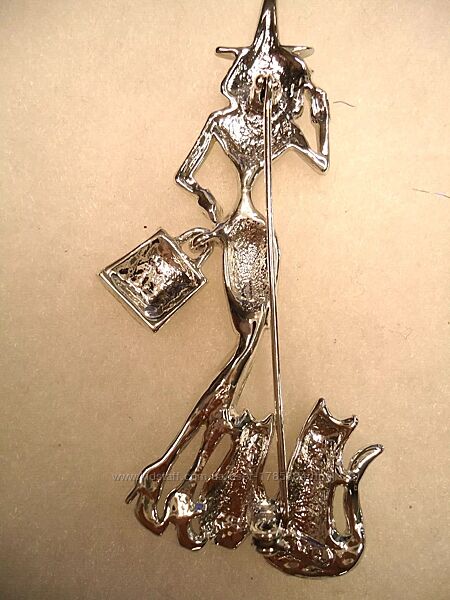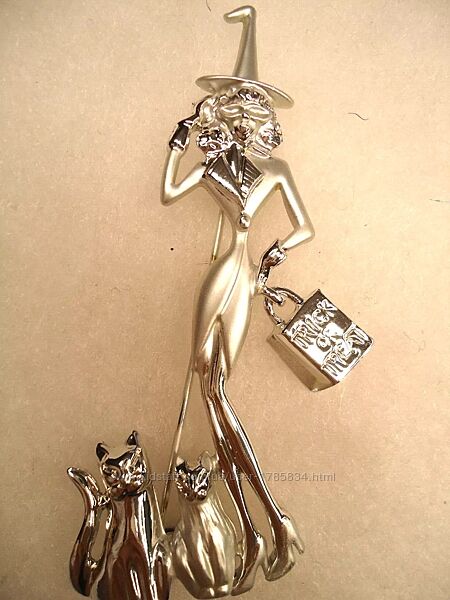 винтажная брошь AJC "Дама с котами" надпись на сумочке «Кошелек или жизнь»Halloween Vintage Heks met Katten Trick or Treat Zilveren Broche