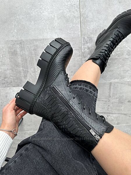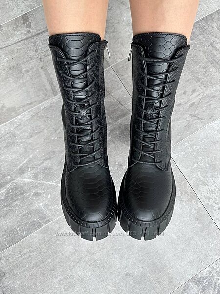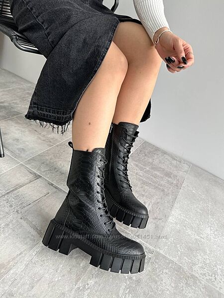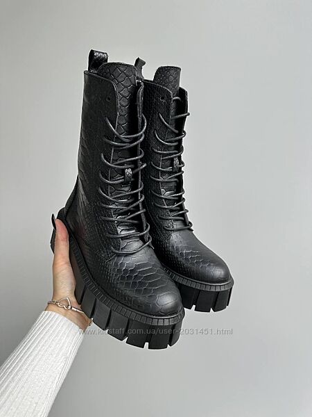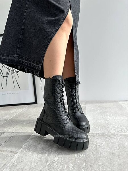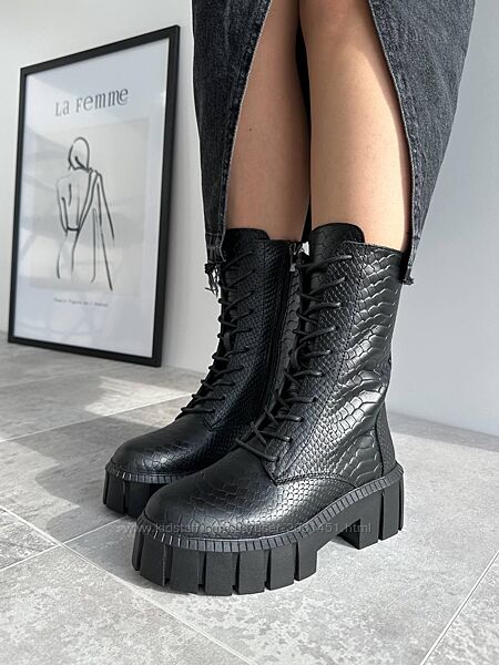 Подробное описание: Ботинки - берцы женские кожаные под рептилию зимние на меху, Черные
