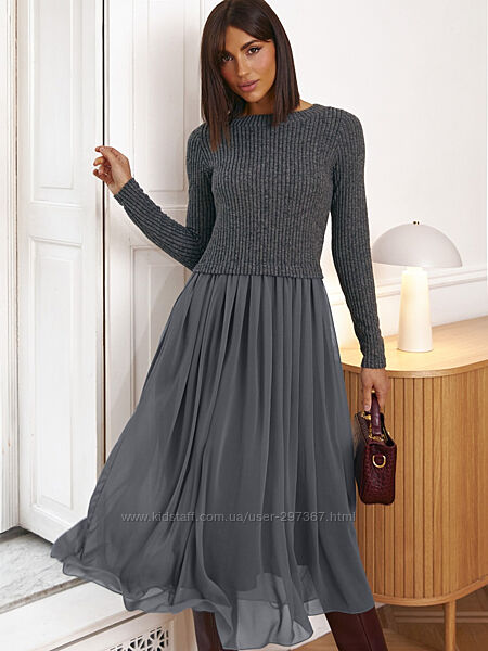 Комбінована сукня: верх із вязаного трикотажу (беж-верх з фактурного трикотажу), спідниця в складку з шифону на натуральній бавовняній підкладці.Ціна від кольору - беж-825грн., чорна - 945 грн., сіра та бірюзова 1045грн.