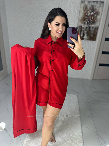 Подробное описание: Пижама тройка женская кофта, брюки и шорты красного цвета П1002