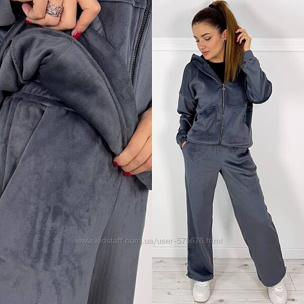 Теплий костюм, кофта вільного крою, з карманами та капюшоном, застібається на змійку. Штани вільного крою, талія на резинці, з карманами, низ штанів можна затягнути на резинку з фіксатором