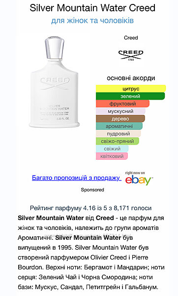 Creed Silver Mountain Water - 90 грн/1 млСвіжий та терпкий чай, зелені освіжаючі та натуральна нота смородини. Фужерний, прохолодний, як горне повітря, абсолютний унісекс.