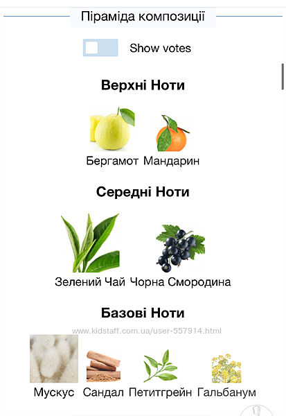 Чиста і бадьора композиція з першої секунди чарує енергійністю цитрусових і зелених нот. Таємниче, ніжне і чарівне серце аромату утворює вишуканий коктейль з нот освіжального зеленого чаю і чорної смородини. Витончені, чуттєві та елегантні ноти мускусу, в обрамленні незвичайної шляхетності сандала, завершують