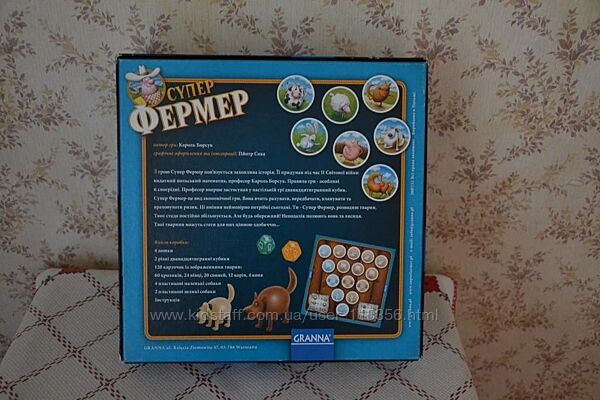 Сімейна гра для 2-6 гравців віком понад 7 років. У відмінному стані, як нова. Дуже висока якість картону. Вміст коробки: 4 дошки, 2 різні дванадцятигранні кубики, 120 карточок із зображенням тварин, 4 платикові маленькі собаки, 2 пластикові великі собаки, інструкція.