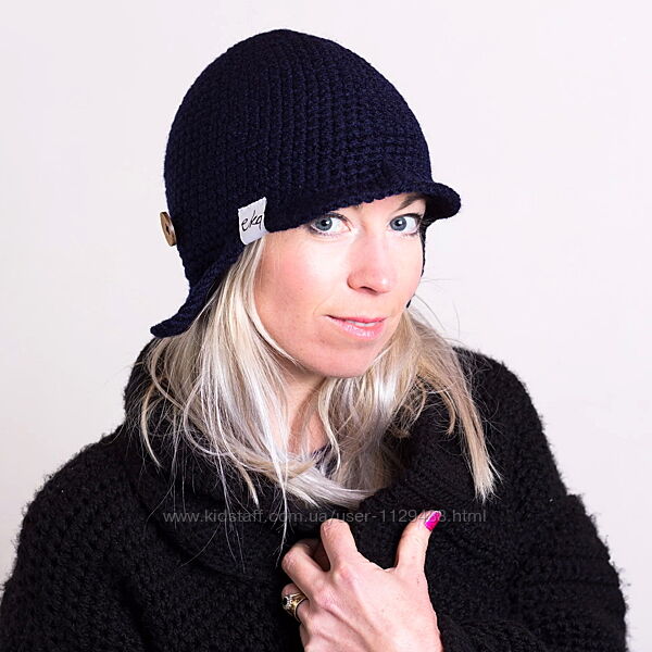 Необычная, толстенькой плотной вязки, в глубоком темно-синем цвете, имеет застегивающиеся на пуговицы ушrи, которые можно расстегнуть, пуговицы деревянные.