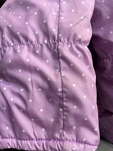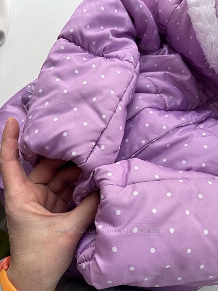 Теплий комбінезон для дівчинки, гарного блідо бузкового кольору. Курточка з двома кишенями, на капюшоні вушка, якісна надійна фурнітура. Комбінезон 50 см по внутрішньому шву. Курточка 51 по спинці, 41 у грудях, 8 см плече і 47 рукав. На штанцях внизу є незначні потертості, плямка на підкладці куртки, в іншому гарний станДругие объявления продавца