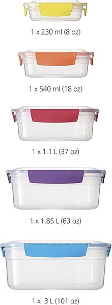 Комплектация - 5 ёмкостей: 0.23 л, 0.54 л, 1.1 л, 1.85 л, 3 л.