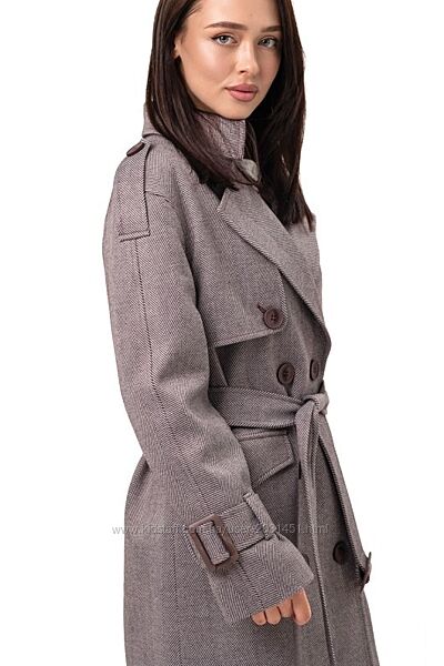 Особенный флер пальто придают детали: паты на рукавах, пагоны на плечах, кокеткa по переду и лаконичный узор в мелкую елочку добавляет изюминку