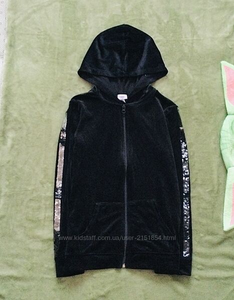 10-12 р., 146-152 зріст Primark велюрова кофта, Худі, толстовка з капюшоном, колір чорний, паєтки - лампаси на рукавах, стан нової, слідів носки немаєдовжина 53; пог 43; рукав від вороту 58