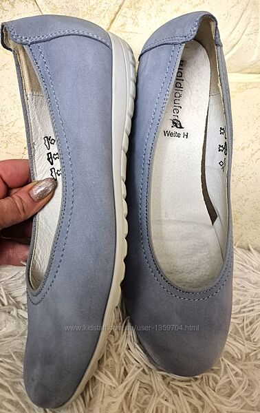 Зручні жіночі балетки Hesima зручної ширини H з колекції Waldläufer. Верх виконаний з м´якого нубуку небесного кольору. Внутрішня підкладка, повністю виготовлена з натуральної шкіри, забезпечує приємний комфорт при носінні. Гнучка гумова підошва.