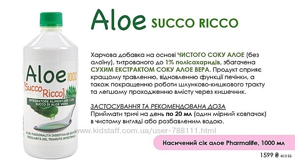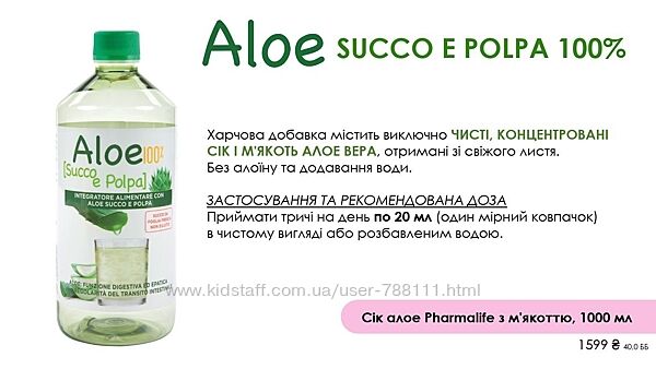 Харчова добавка «Сік алое з м´якоттю 100%» містить лише чистий сік і м´якоть алое вера, отримані зі свіжого листя, без додавання води, концентровані й очищені від алоїну. Добавка сприяє кращому травленню, відновленню функції печінки, а також покращенню роботи шлунково-кишкового тракту та легшому проходженню вмісту через кишечник. Ба більше, гель з алое незамінний для природної детоксикації організму, зміцнення імунітету, пригнічення запальних процесів, нормалізації мікрофлори кишківника. Крім того, надкорисний напій від Pharmalife глибоко зволожує й живить організм зсередини, підвищуючи рівень енергії та підтримуючи здоров´я вашої шкіри. Харчова добавка буде особливо корисною при низькокалорійних дієтах. Приймаючи добавку щодня на постійний основі, ви допоможете собі відчутно оздоровитися і почуватися краще!Алое вера культивується в Африці, Індії та тропічних і субтропічних регіонах Америки в основному для отримання гелю. Протягом тисячоліть рослина адаптувалася до складних умов навколишнього середовища, виробивши захисні властивості від посухи та стратегії захисту від мікробів і паразитів з одночасним зберіганням мінералів і поживних речовин. Листя алое світло-зелене, м´ясисте; лист рослини, в свою чергу, має 3-шарову структуру, де внутрішній шар (паренхіма) багатий на гель – драглисту речовину з великою кількістю активних інгредієнтів.