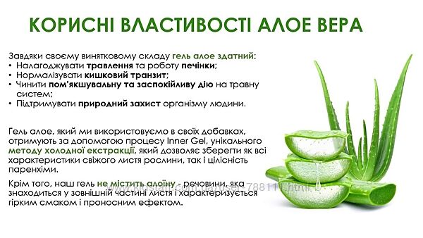 Сік гелю алое вера містить фітокомплекс із 200 активних інгредієнтів і понад 75 поживних речовин, серед яких: