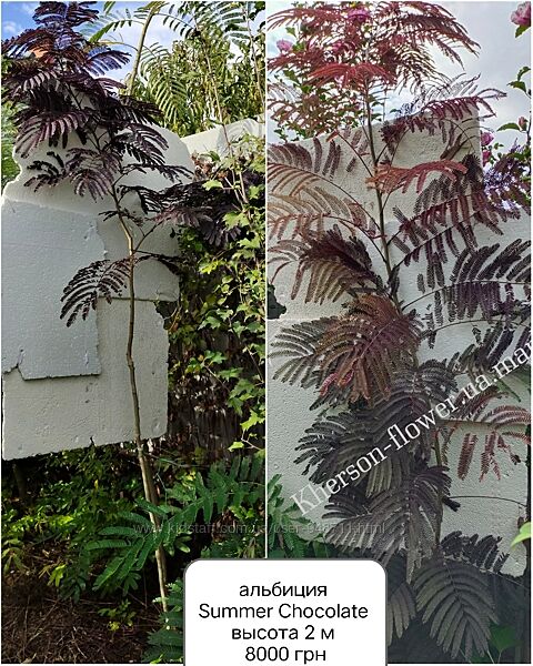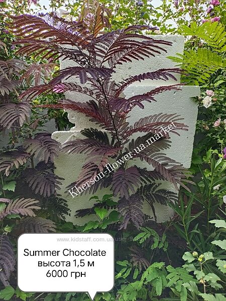 Summer Chocolate - это очень редкий сорт альбиции. Уникален он цветом своих листьев.Сначала лист распускается зелёным, а по мере вызревания краснеет, становясь в результате бордовым и очень ярко выделяется среди других растений.