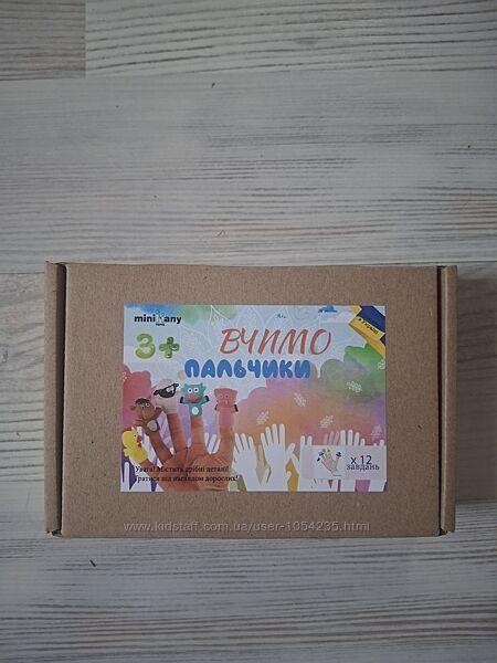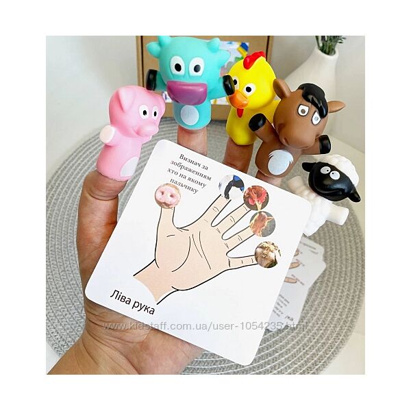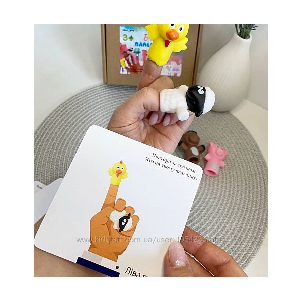 2. Развивающий набор "Учим пальчики". Учим пальчики, развиваем моторику рук, тренируем звукоподражание. 5 смешных животных (пальчиковый театр) и 6 двусторонних карточек с заданиями разных уровней сложности помогут малышу интересно и полезно провести время. Самым маленьким деткам показываем представление и озвучиваем речь животных, тем самым стимулируя развитие речи. Со старшими детками выполняем задания по карточкам, тем самым изучая названия пальцев, развивая память и логическое мышление. Постепенно усложняем и придумываем свое (жабка живет рядом с безымянным пальчиком, но не на мизинце. Где живет жабка?). В наборе есть такие задания, как собери по фото (частичные фрагменты фото животных), собери по рисунку животных, от кого какая польза. Возрастная категория 3+. Цена: 350 грн.