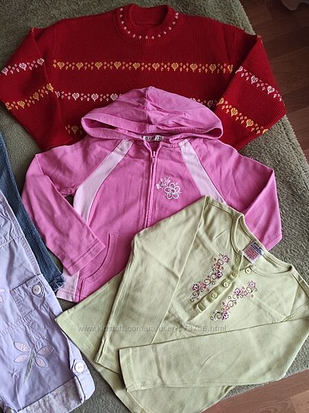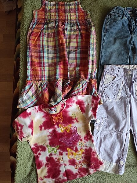Комплект якісного, яскравого та зручного одягу для дівчинки. У комплекті сарафан, джинси, літні брючки, реглани, футболка, напіввовняний светрик. Різні іноземні бренди, стан гарний. Ціна комплекта -200грн. Можлива пересилка.Є багато різного одягу меншого і більшого розміру.