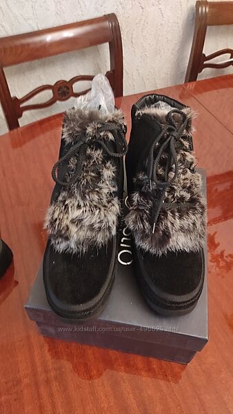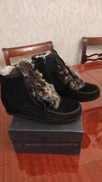 Дуже гарні зимові черевики 39р, повномірні, устілка 25см, невелика танкетка, застібка молнія і шнурівка, підошва, не слизька.Натуральна замша та вовна в середині, оздоблені зверху штучним хутром.