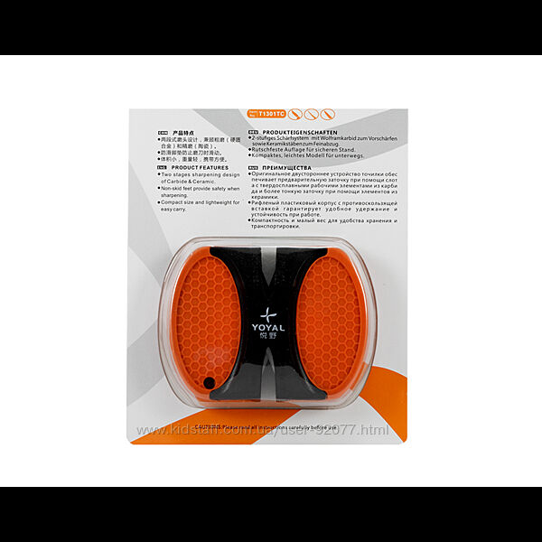 Заточувальний пристрій має рифлений корпус та протиковзну вставку, що допоможе надійно зафіксувати його під час роботи.