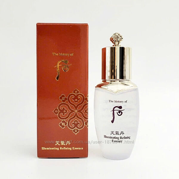 The History of Whoo Illuminating Refining Essence — освітлююча очисна есенція, збагачена спеціальним комплексом Hwa Hyun RefiningTM і PyrujuvenTM, секретною формулою, яка пробуджує найвищу енергію ясності, надаючи шкірі вдосконалену та оптимальну текстуру з першого кроку процедури догляду за шкірою. Завдяки дивовижним інгредієнтам Cheongidan Illuminating Refining Essence шкіра стає очищеною, зволоженою й еластичною. Пори та зморшки менш помітні через коротшу регенерацію клітин шкіри. Ця королівська процедура наповнює шкіру оптимальною прозорістю і вишуканою текстурою, відроджує молодість шкіри зсередини. Після використання очисної есенції Cheongidan Illuminating Refining Essence* шкіра стає миттєво більш сяйною; Підвищення чистоти шкіри після 2-тижневого використання; +30% очищена шкіра після 4-тижневого використання