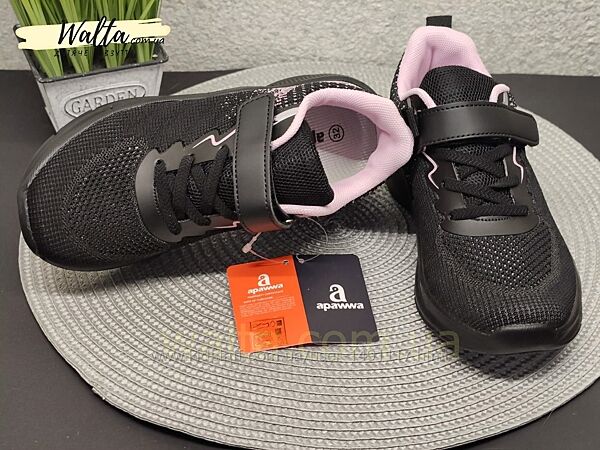 Кросівки від фірми Apawwa (Румунія) чорні з рожевим дівчаткам. На липучці+шнурівка-обманка. Підошва легенька, схожа на пінку. Можна носити як варіант на фізкультуру.