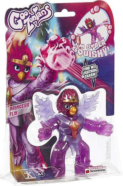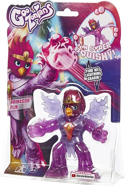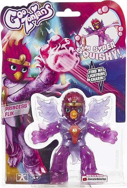 Розтягніть і хлюпайте свою героїню Принцесу Флік, вона завжди повертатиметься до своєї початкової форми! Стисніть її та подивіться, як її липке тіло рухається та розтягується! Здавіть її, щоб відкрити її чарівну силу блискавки. Флік бере з собою свої електрифікуючі сили в усі свої пригоди GooZonian!Принцеса Флік — наймолодша спадкоємиця престолу GooZonian. Флік любить ділитися замком з Ембер і чудовими пригодами, які він пропонує. Королівський обов´язок і уроки історії вона любить значно менше. Флік вважає, що справжня принцеса повинна патрулювати королівство, готова битися з Кам’яним Серцем будь-де та будь-коли. Як наслідок, вона більш ніж трохи імпульсивна.