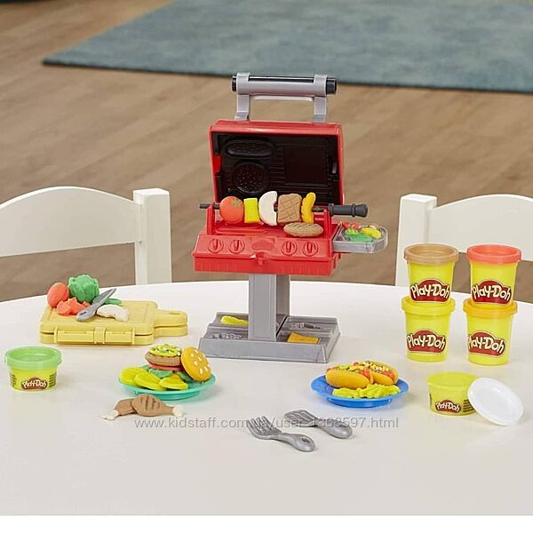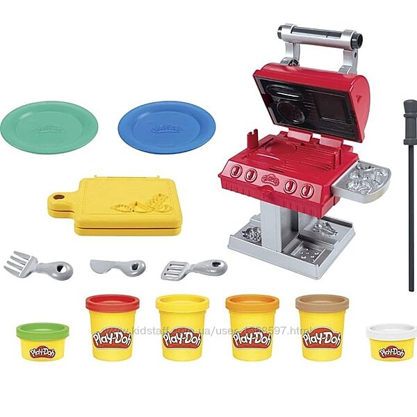 💕У комплекті: гриль; маса для ліплення червоного, помаранчевого, жовтого, білого, зеленого і коричневого кольорів; ніж; виделка; лопатка; 2 тарілки; шампур; аксесуари.