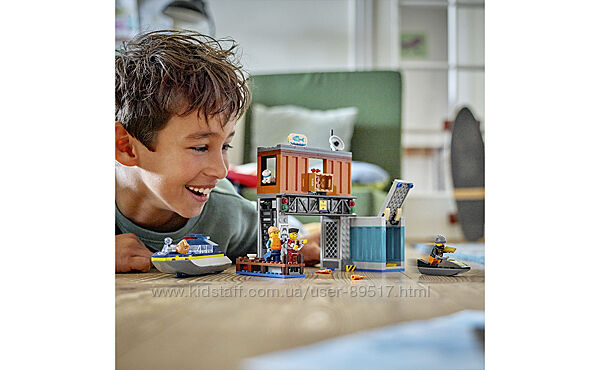 Притулок грабіжників та поліцейський катер. Діти від шести років і старші можуть взяти участь у затриманні поганих хлопців за допомогою набору «Поліцейський катер та катер грабіжників» LEGO® City.Вміст коробки. У комплект входить все необхідне для збирання катера, водного мотоцикла, сцени з портом та контейнерами, а також мініфігурки поліцейського, двох злодіїв та фігурки собаки.Особливості та функції: діти можуть активувати пастку для риби та функцію швидкого втечі, а також сховати злодійський видобуток у схованці.У комплект входить плакат про розшук — з дозволу дорослих діти можуть відсканувати QR-код, вказаний в інструкціях зі збирання або на коробці, та подивитися кумедне відео за участю поліцейських LEGO City.Подарунок на будь-який випадок – це чудовий подарунок на день народження, свято або будь-який інший день для дітей від шести років та старше, які люблять захоплюючі ігри та кораблики.Відкрийте для себе світ творчих ігор – подаруйте дітям більше задоволення та пригод, поєднавши цей набір з іншими наборами LEGO City (продаються окремо).Місто без кордонів. LEGO City — це місце, де діти можуть дати волю своїй уяві, створюючи будівлі, транспортні засоби та мешканців, які мотивують їх будувати, творити, відкривати для себе та грати.Розміри: розміри злодійського притулку в цьому наборі з 311 предметів становлять 19 см заввишки, 20 см завширшки і 12 см завглибшки.