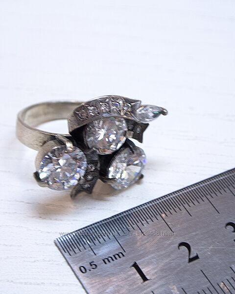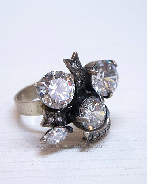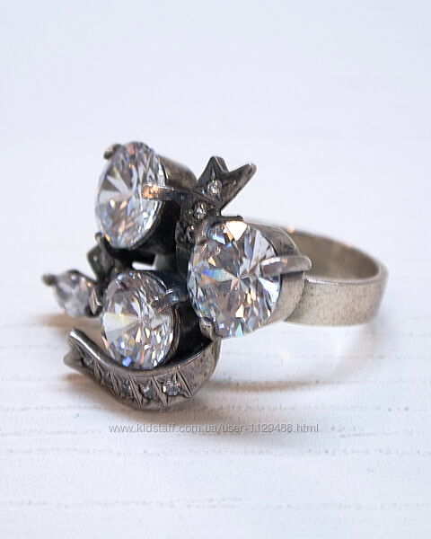 Заметное, эффектное, необычного дизайна с крупными вставками циркона. Огранка камней очень удачная, ослепительно ярко сверкают. Фабричное, выполнено из серебра 925 пробы.